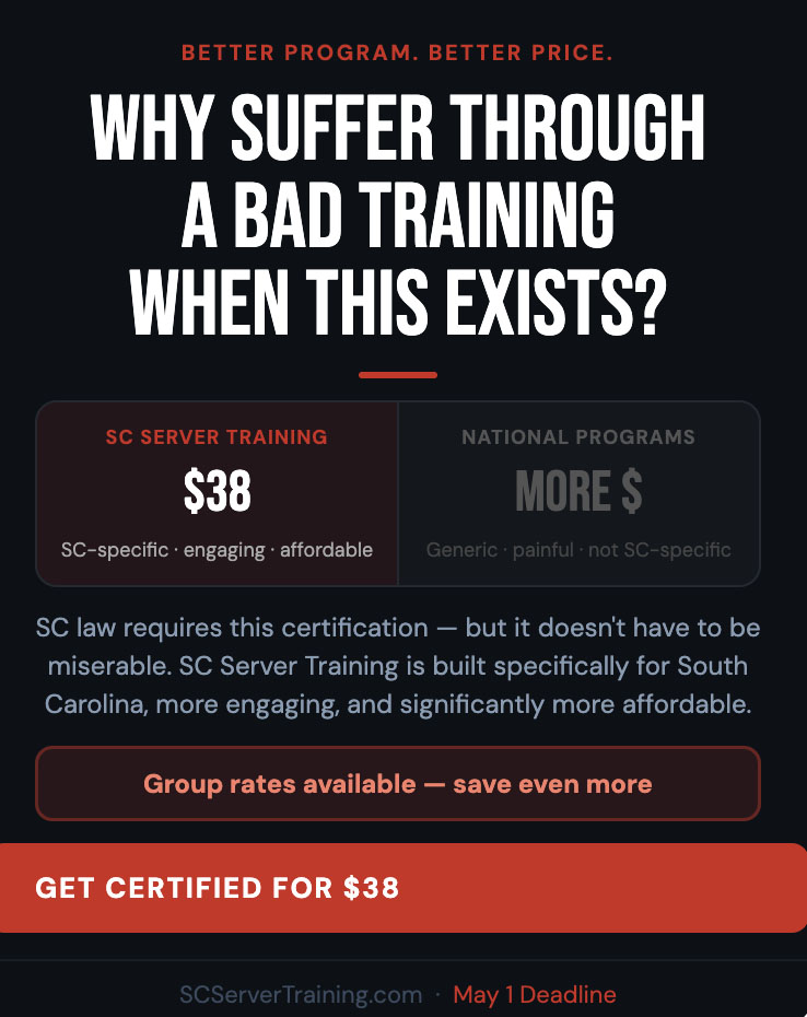 Get certified to serve alcohol legally in South Carolina. Complete the state-approved online course, pass the required tests, and download your official server certificate through MyDORway.